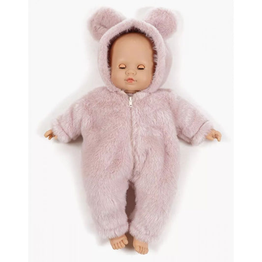 MINIKANE - POUPEE 36CM - CUTIES - EMILIE CORPS MOU, YEUX DORMEURS ET SA COMBINAISON WINNIE EN FAUSSE FOURRURE ROSE
