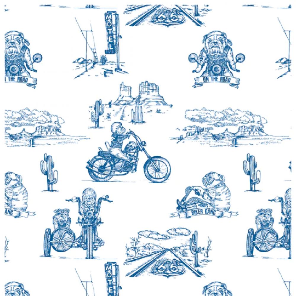 Chevaucher une moto et faire la route 66 : le rêve de tout biker ! Pour l'occasion c'est le gros Juju, bouledog anglais de naissance qui revisite la toile de jouy pour une virée Rock !