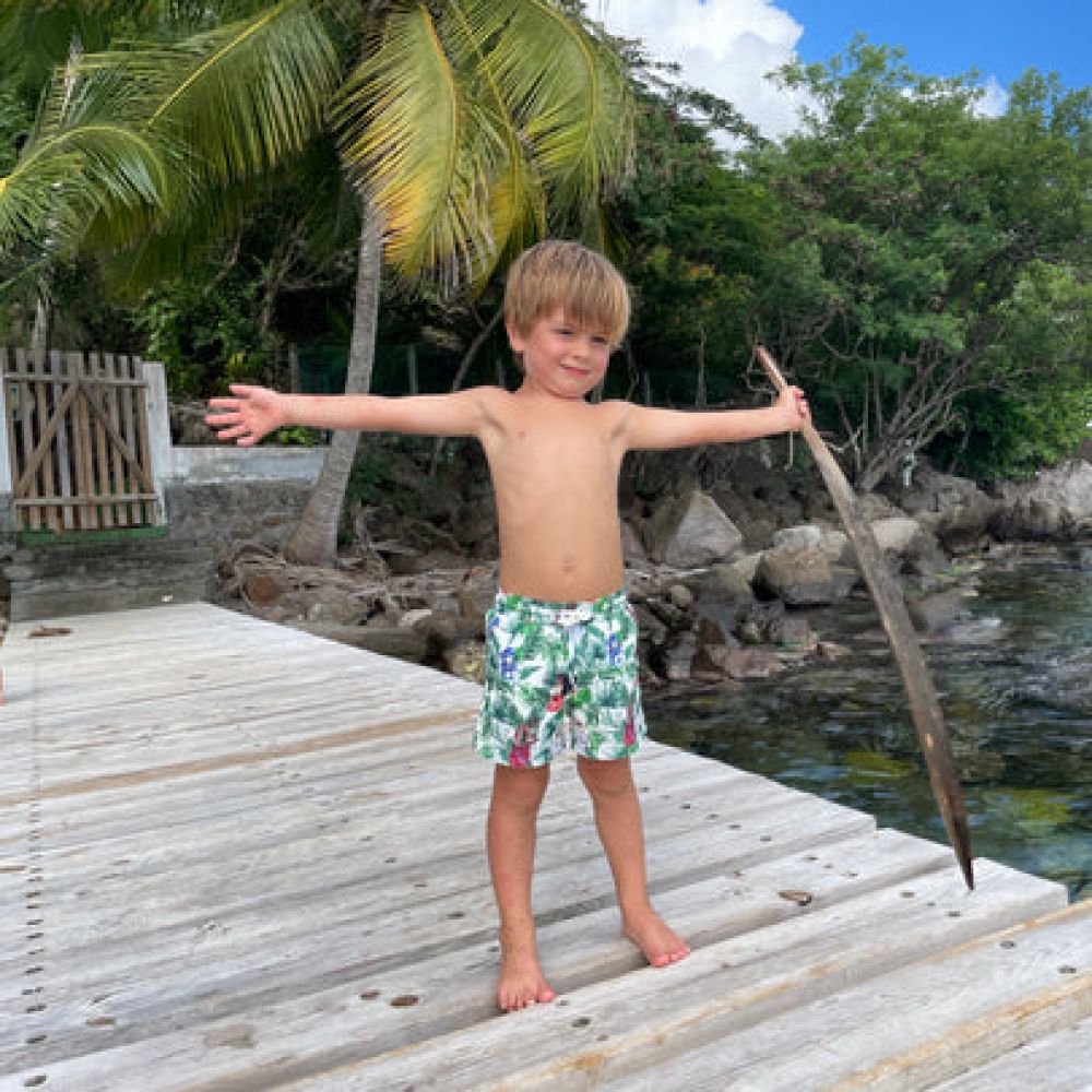 Sa ceinture élastique se resserre par un cordon pour l’ajuster à la taille de l’enfant.