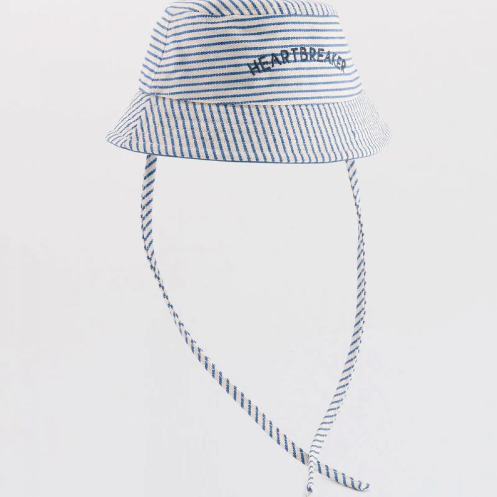 Bob bébé enfant (du 3 mois au 6 ans)rnrnModèle réversible : recto rayures bleues / verso uni bleurnrnBroderie : Heartbreaker sur les deux côtésrnrnCertifié Oeko-TexrnrnBob réversible avec broderiernrnLien de serrage sous le cou jusqu'à la taille 9-24 mois