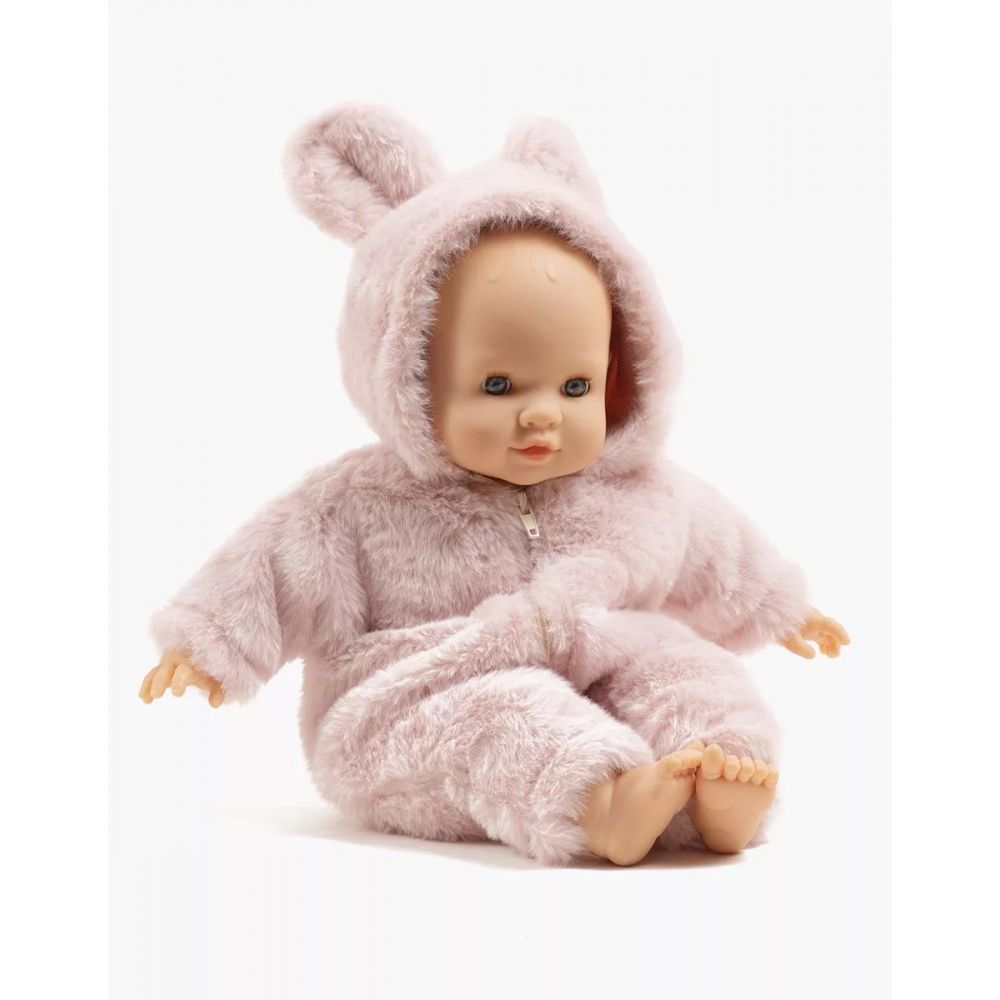 MINIKANE - POUPEE 36CM - CUTIES - EMILIE CORPS MOU, YEUX DORMEURS ET SA COMBINAISON WINNIE EN FAUSSE FOURRURE ROSE