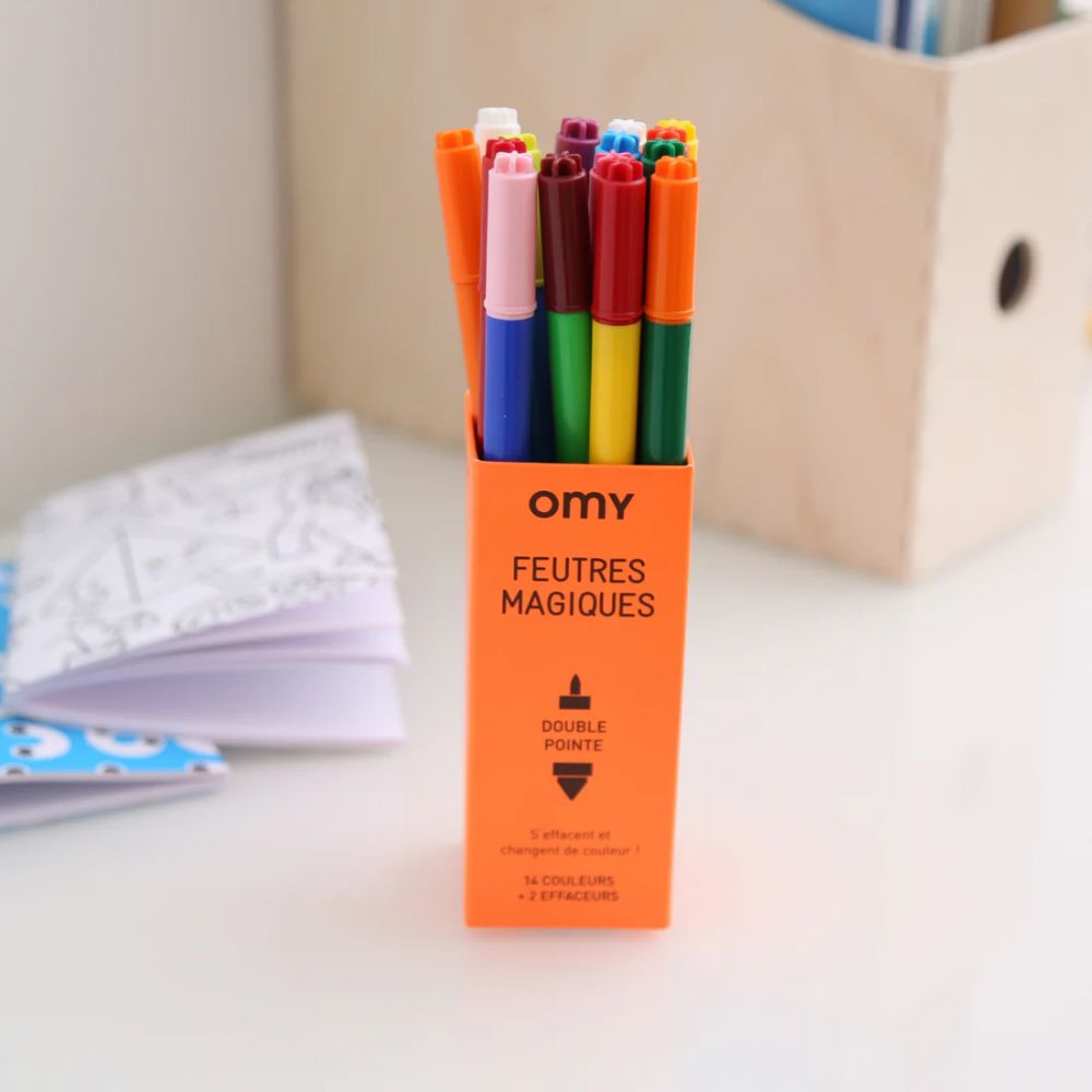 Complément indispensable des coloriages OMY, ces feutres double-pointe (fine et large) s’effacent ou changent de couleur grâce aux 2 effaceurs inclus.