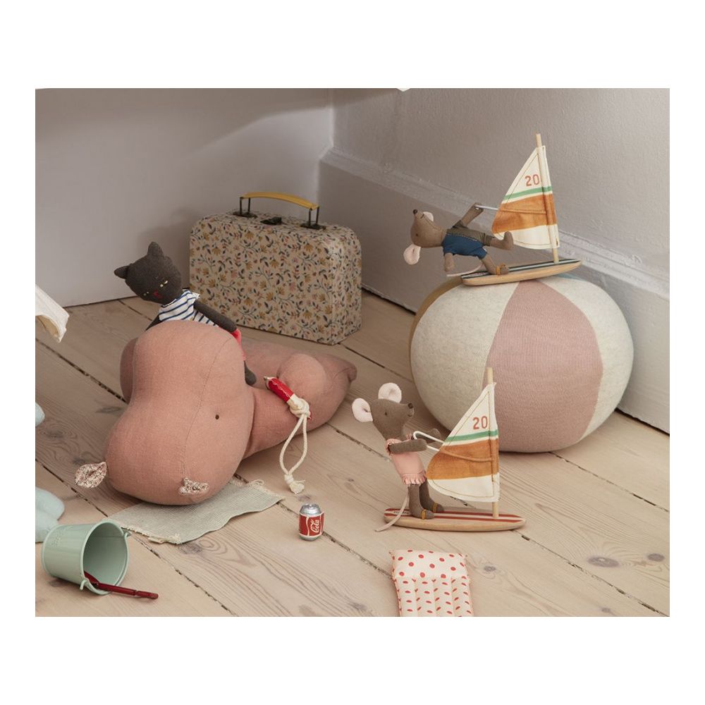 C'est les vacances! Cette souris est prête pour une journée à la plage. Elle porte une combinaison et a apporté sa planche à voile pour profiter de la mer. La planche et le mât sont en bois.