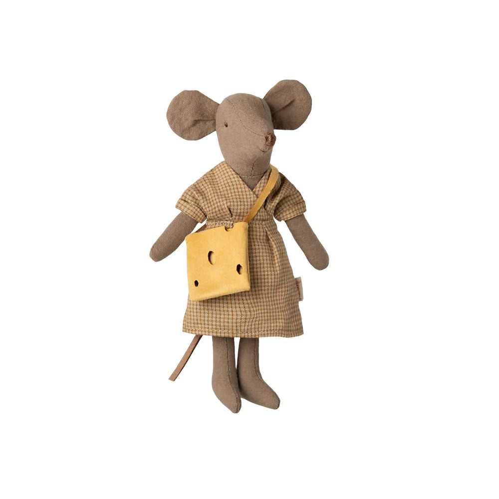 Maman souris en tissu marron clair. Elle porte une robe et un sac jaune à trous.Cette souris convient aux meubles et accessoires de la taille Souris.
