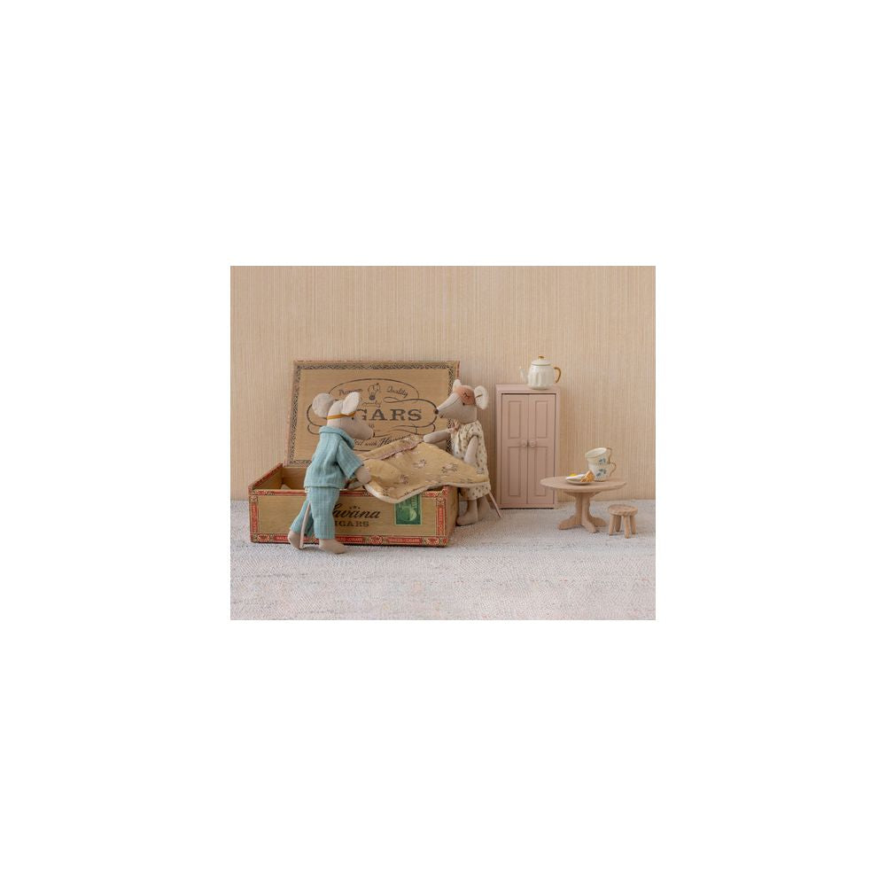 Un classique Maileg. Maman et Papa souris portent leurs beaux vêtements de nuit et leurs masques sur les yeux. La boîte à cigares est un lit parfait pour une bonne nuit de sommeil et de beaux rêves.