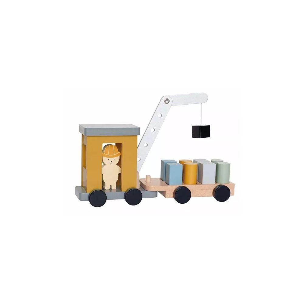 Camion grue en bois. La grue est stable et peut soulever les blocs. Elle peut aller dans différentes directions, descendre et monter. 8 blocs avec aimant, sont associés au camion ainsi qu'un conducteur.
