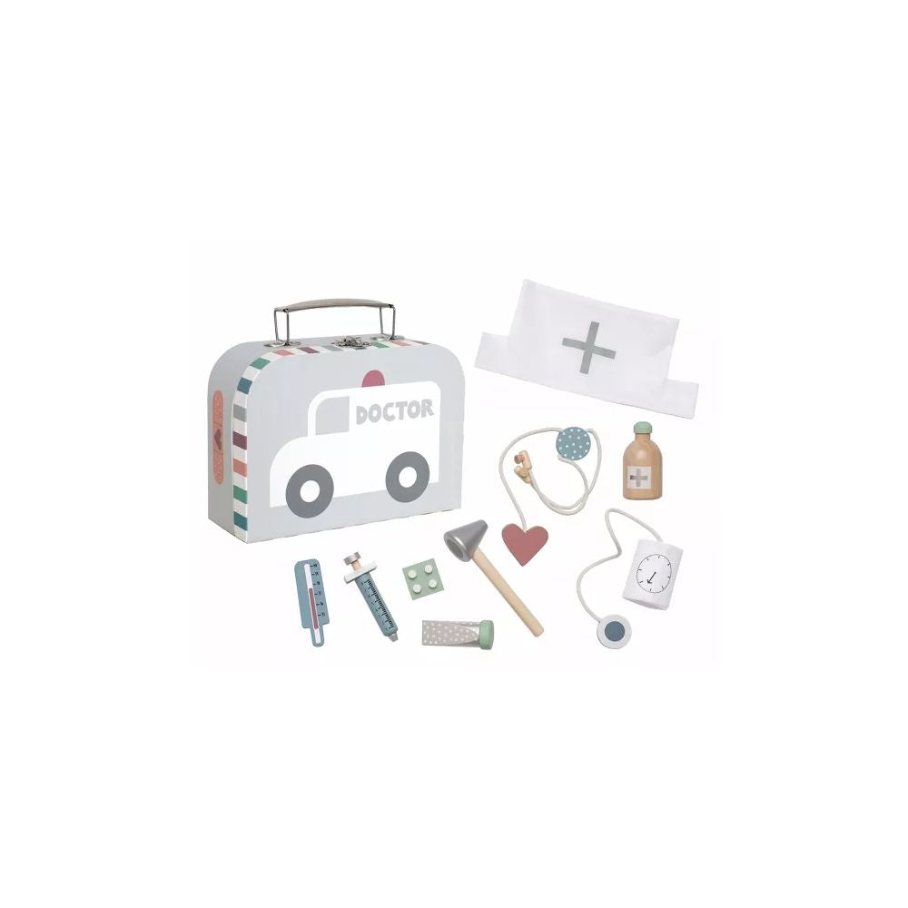 Une petite malette de docteur pour s'amuser à être grand et à soigner les petits bobos ! Composition des produits en bois ou carton : Une malette, une seringue, un thermomètre, un stéthoscope, un otoscope, un appareil pour prendre la tension, des pastilles et un bandage. existe en bleu et en rose. Dimensions de la boîte : 19 x 13 x 7 cm.
