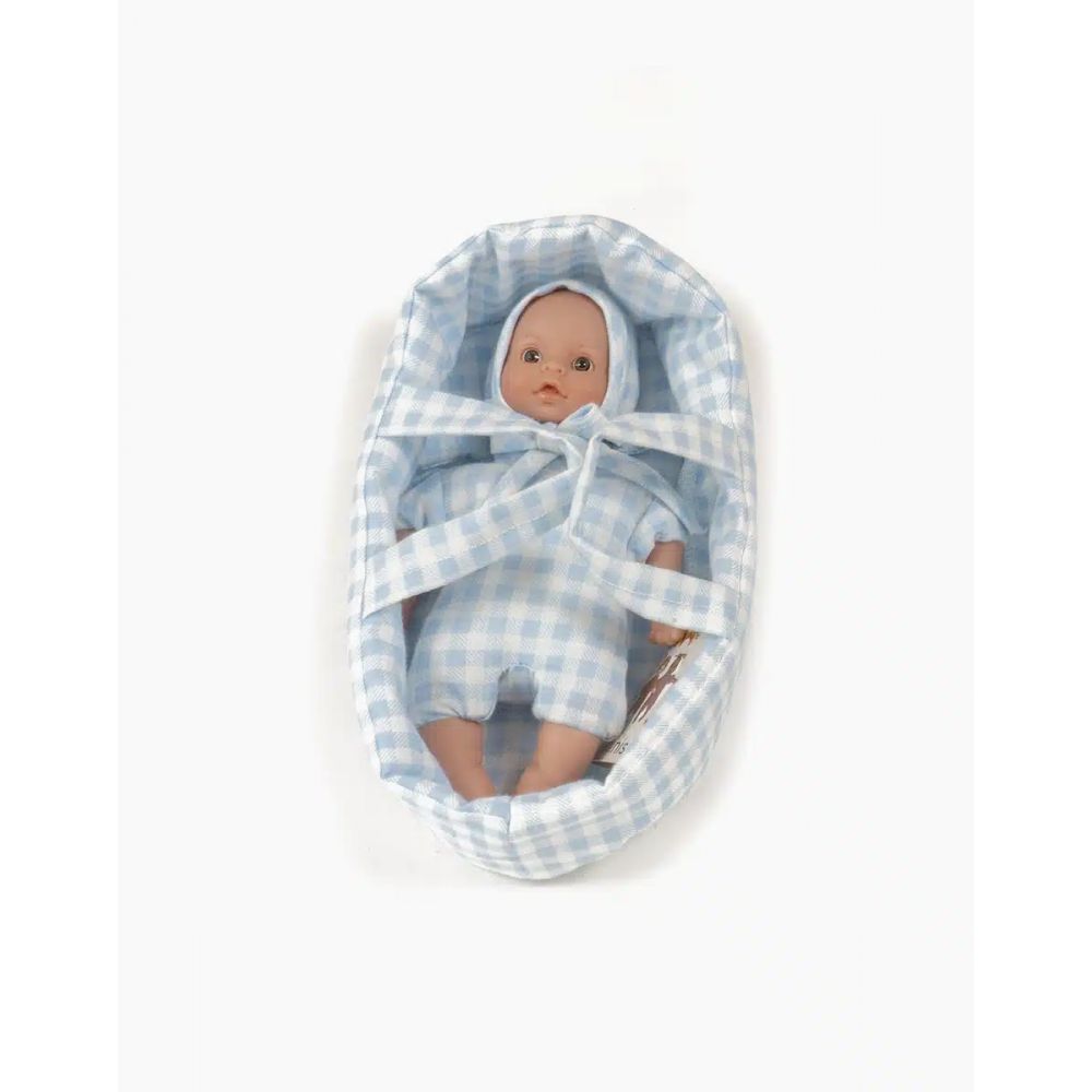 MINIKANE - POUPEE 17CM - MINIS – TEO AUX YEUX FONCES ET SON COUFFIN VICHY BLEU CIEL