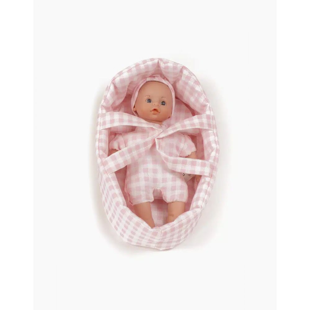 MINIKANE - POUPEE 17CM - MINIS – TEA AUX YEUX CLAIRS ET SON COUFFIN VICHY ROSE PETALE